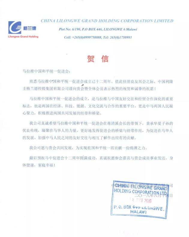格兰德控股集团应邀出席马拉维中国和平统一促进会成立12周年庆典活动