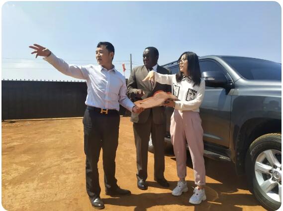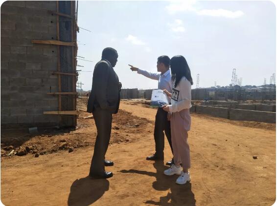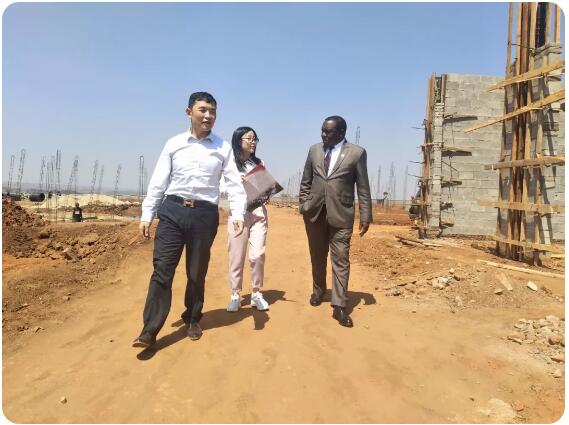 8月16日上午,马拉维总统办公室常任秘书长Cliff Chiunda心系利隆圭格兰德物贸园的建设情况,在公司总裁马占江陪同下,于百忙中莅临园区施工现场视察指导。
