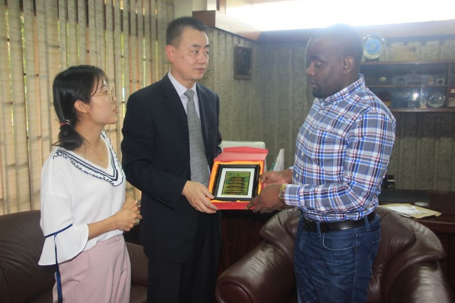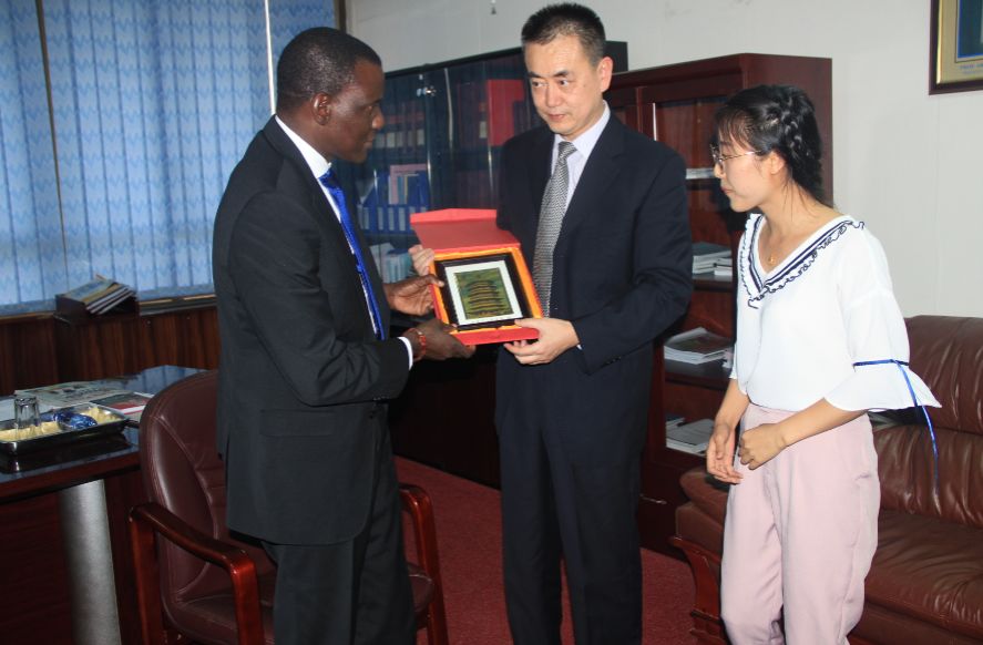 郑晓峰处长向利隆圭市市长德斯蒙德·比克克赠送纪念品