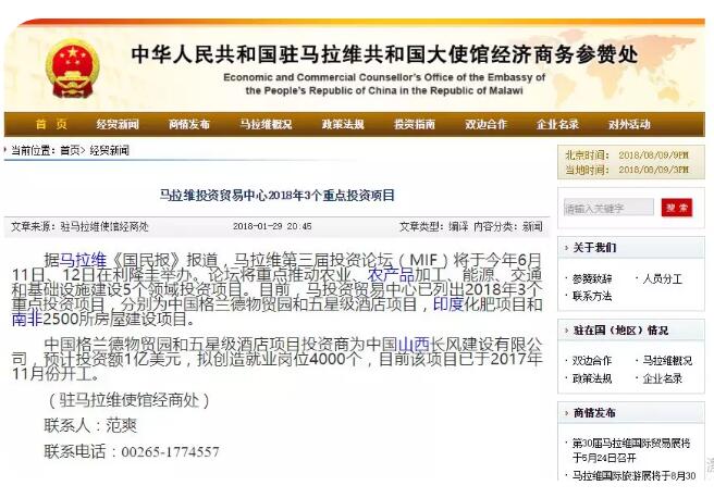 中国驻马拉维大使馆经济商务参赞处刊文:中国利隆圭格兰德物贸园为马拉维投资贸易中心2018年3个重点投资项目之一。预计投资额1亿美元,拟创造就业岗位4000个。